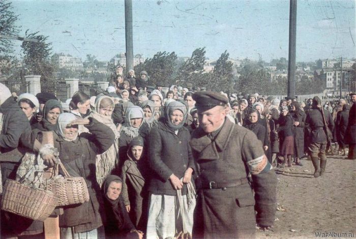 Украинские полицаи поддерживают порядок в толпе женщин в оккупированном Киеве [2]